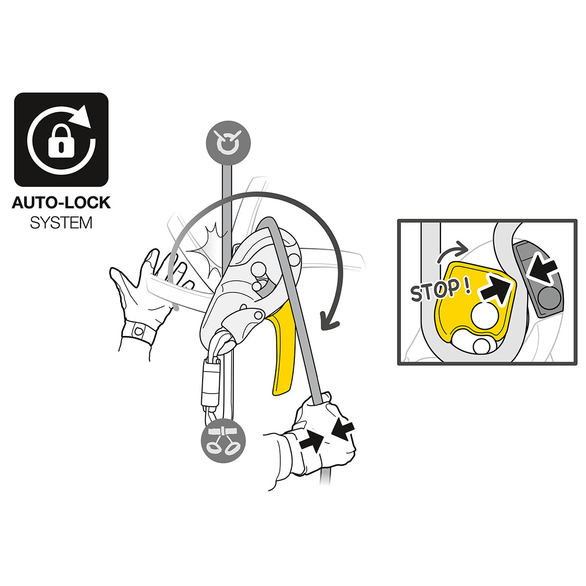 - Eine Sicherheitssperre reduziert das Risiko eines Unfalls aufgrund einer falschen Installation des Geräts am Seil