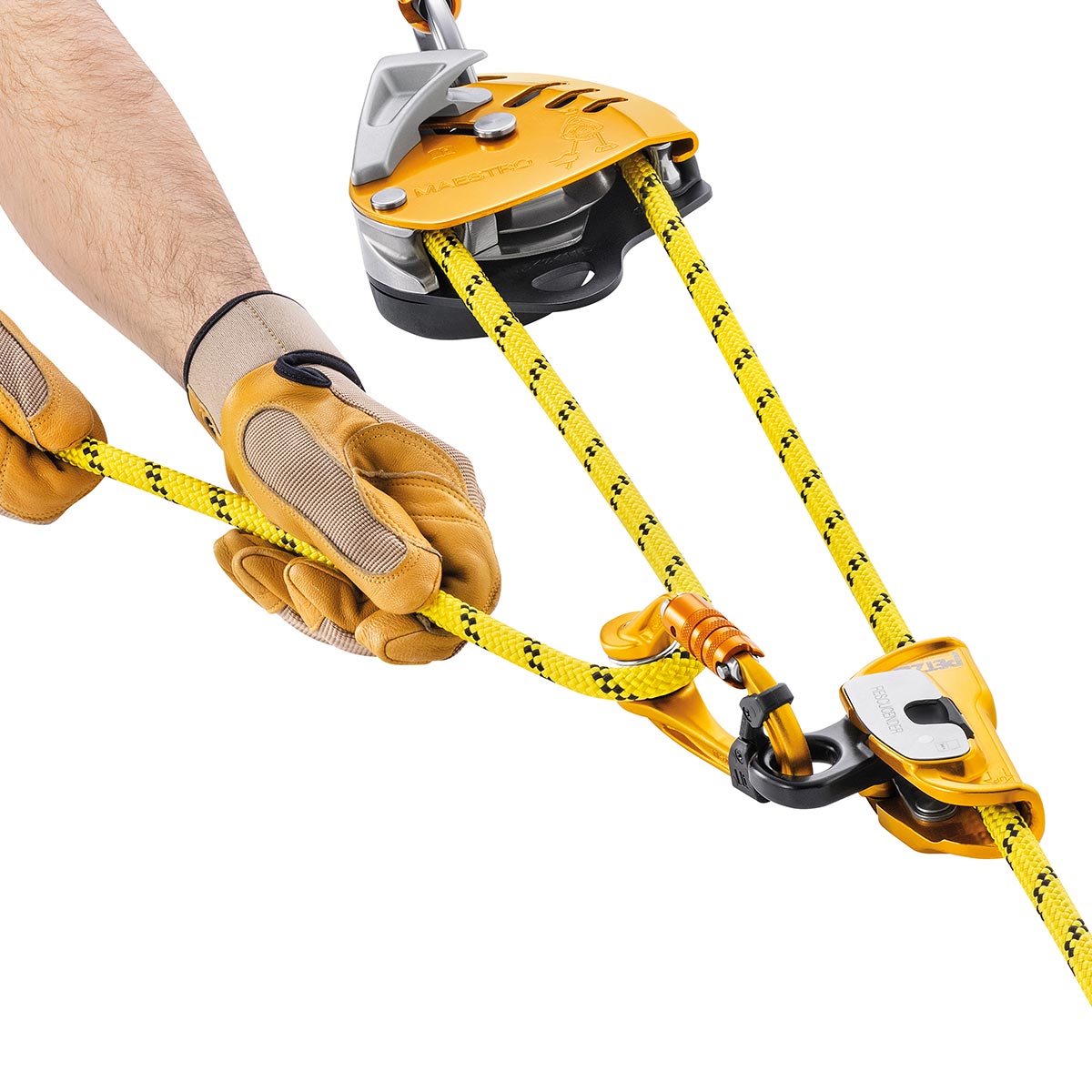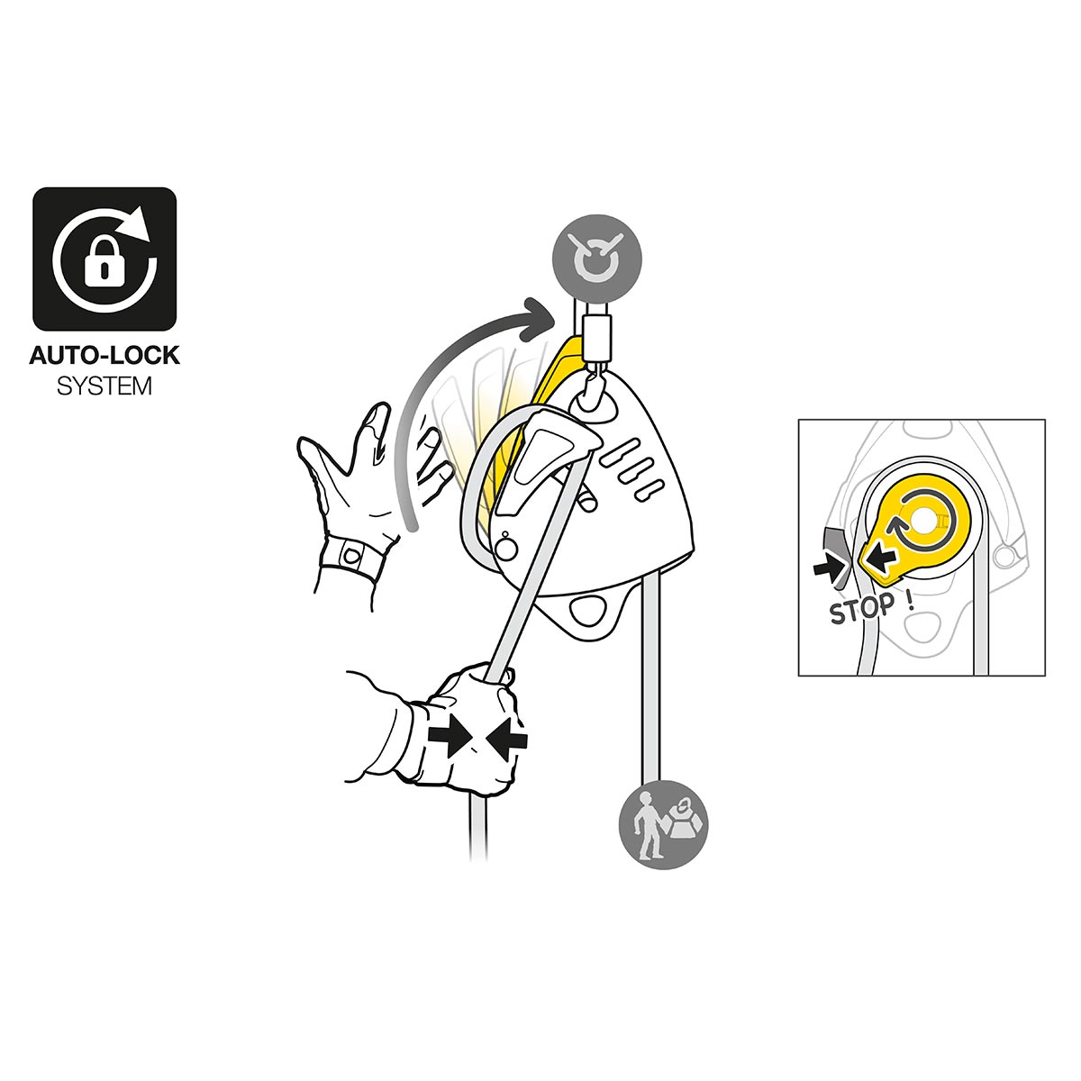 - Das Blockiersystem mit integrierter Umlenkrolle mit Rücklaufsperre ermöglicht die Verwendung desselben Geräts zum Abseilen und zum Heben